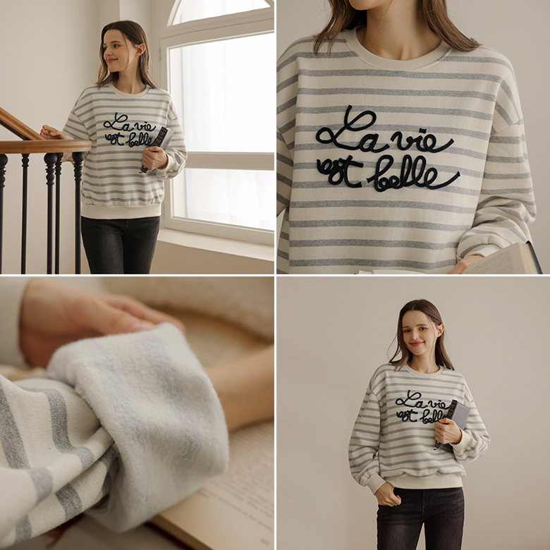 [뮤즈린] 나스 레터링 자수 스트라이프 맨투맨 [기모]