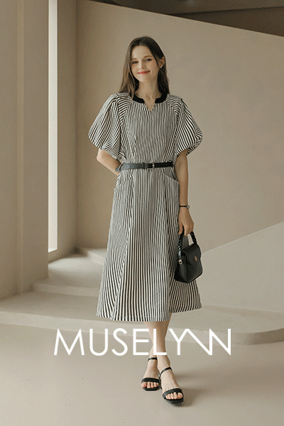 • [뮤즈린] [벨트set] 에벤 스트라이프 퍼프소매 롱 원피스