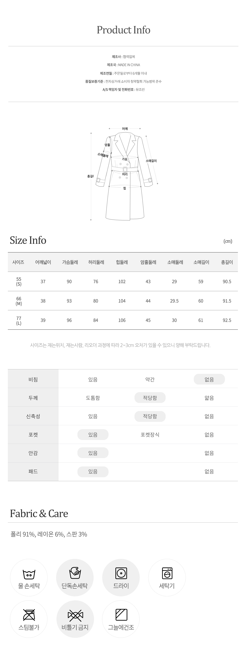 폴리에스터 91%, 레이온 6%, 폴리우레탄 3%