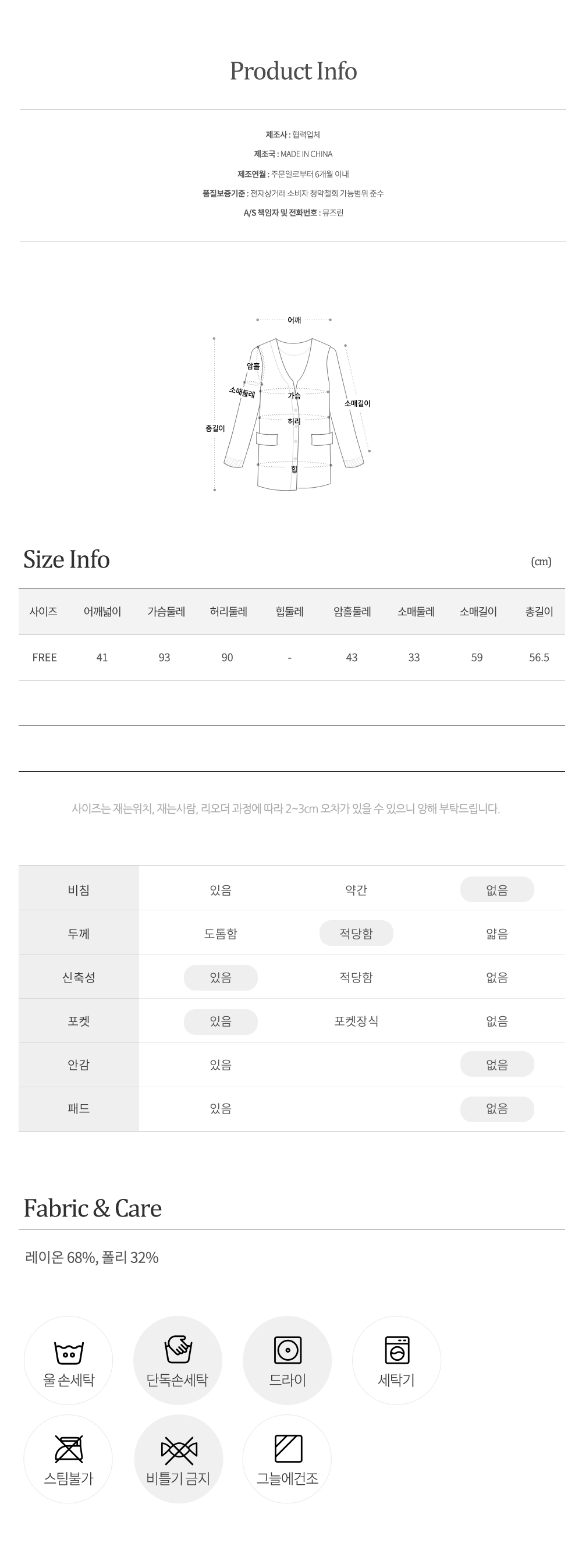 물세탁을 할 경우 건조후 약간의 수축현상이나 이염현상이 발생할 수 있으니 드라크리닝을 권장해 드립니다.