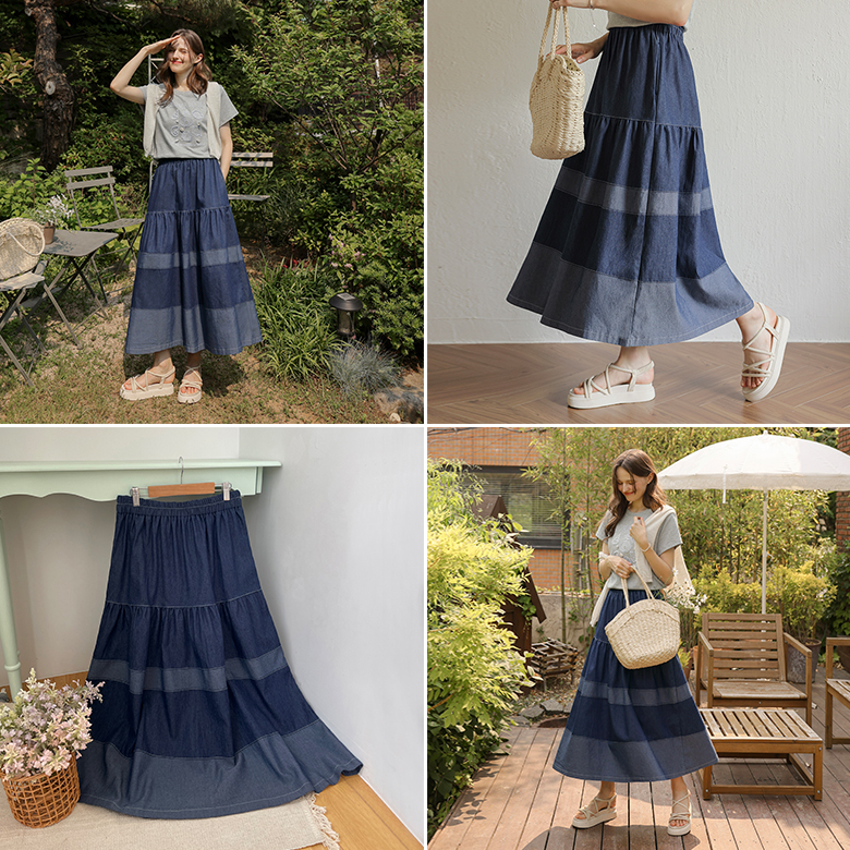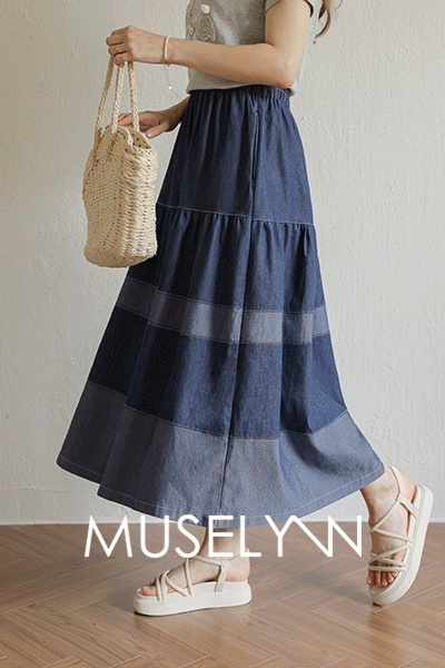 [뮤즈린] 은조 배색 데님 롱 스커트 [밴딩]