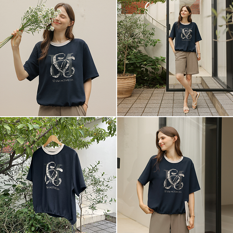 [뮤즈린] 엠브 프린팅 배색 스트링 블라우스 티