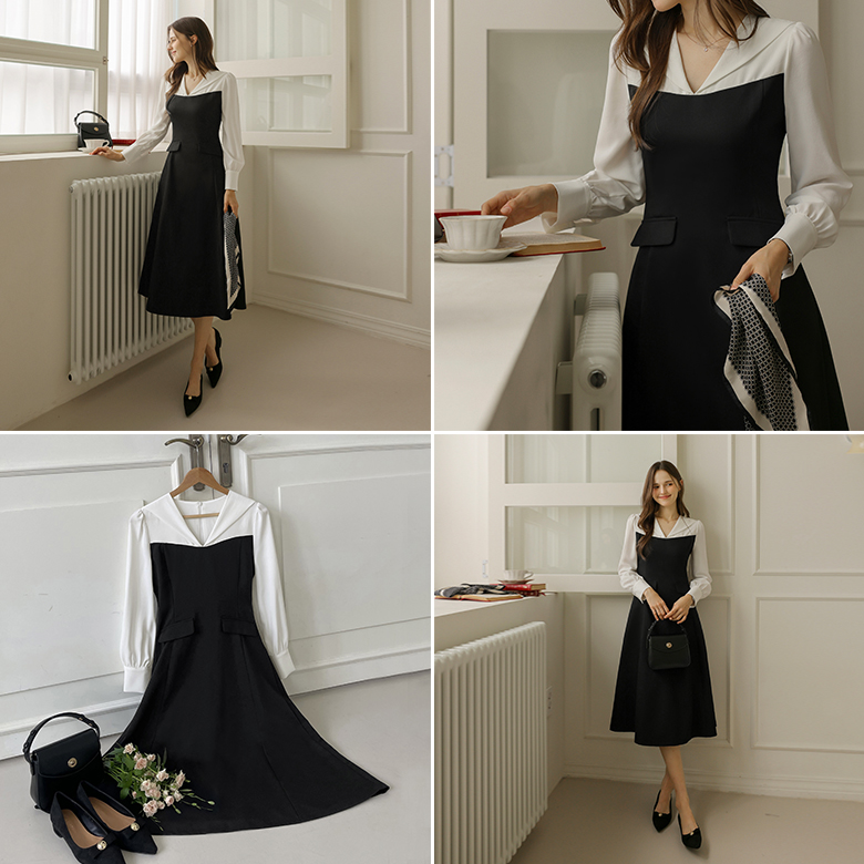 [뮤즈린] 홀릭 배색 플레어 롱 원피스