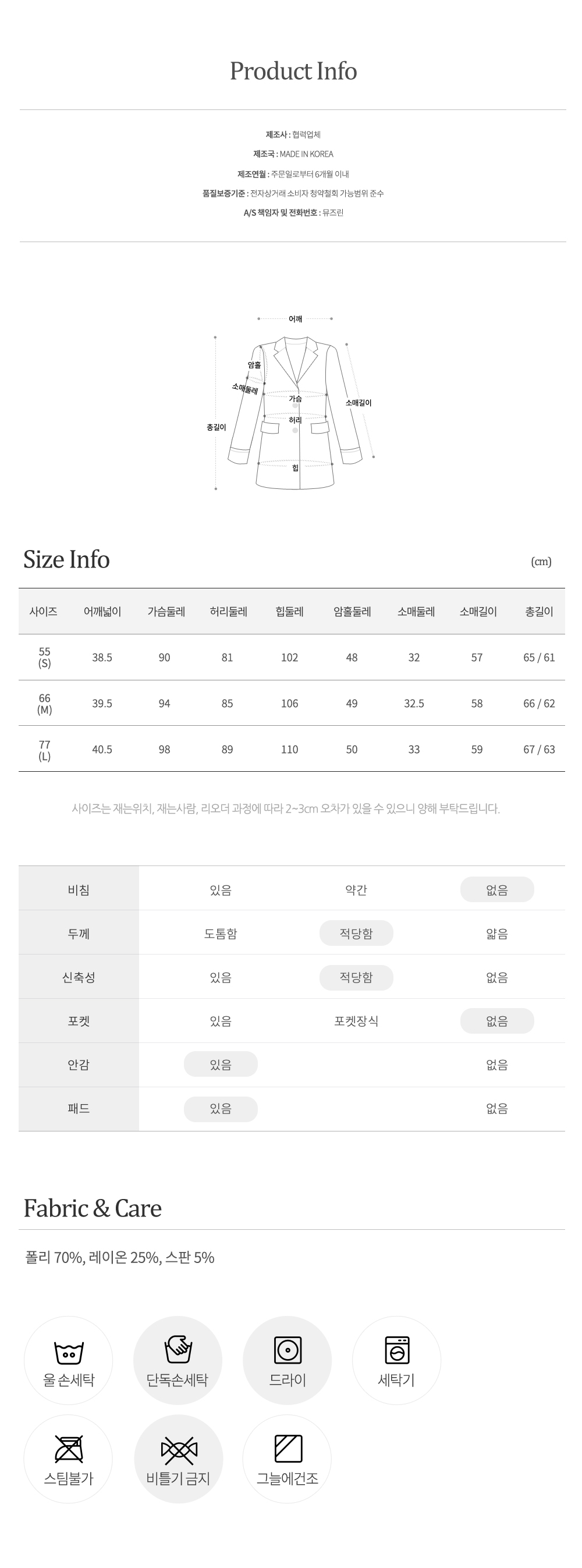 물세탁을 할 경우 건조후 약간의 수축현상이나 이염현상이 발생할 수 있으니 드라크리닝을 권장해 드립니다.