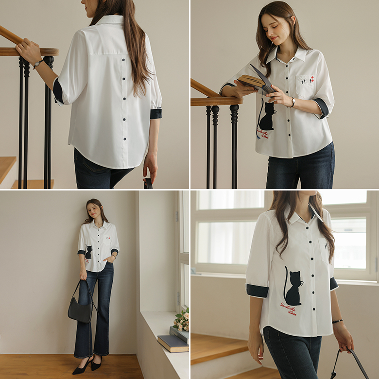 [뮤즈린] 키튼 고양이 배색 7부 셔츠
