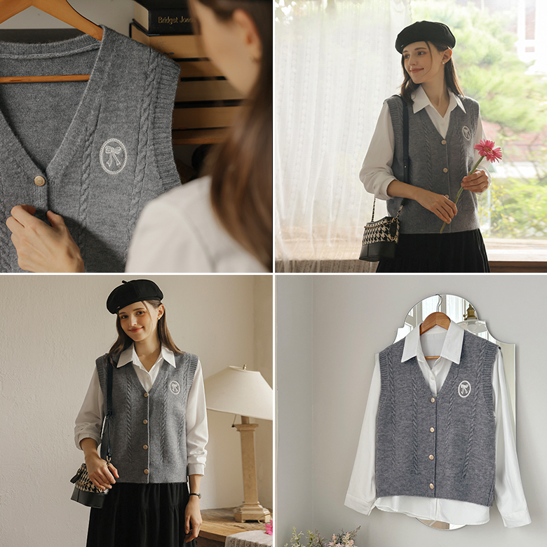 [뮤즈린] 시오 리본자수 셔츠+니트조끼 SET