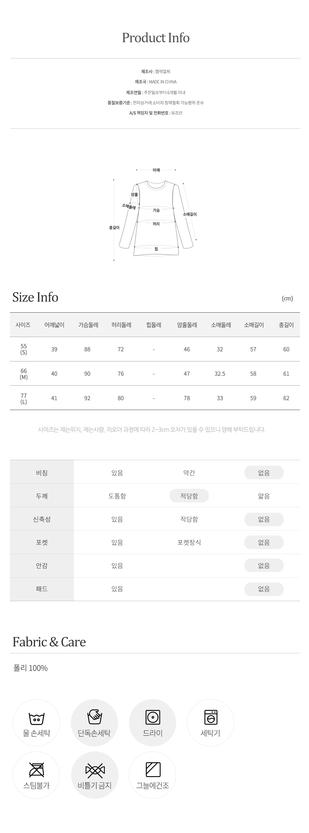 물세탁을 할 경우 건조후 약간의 수축현상이나 이염현상이 발생할 수 있으니 드라크리닝을 권장해 드립니다.