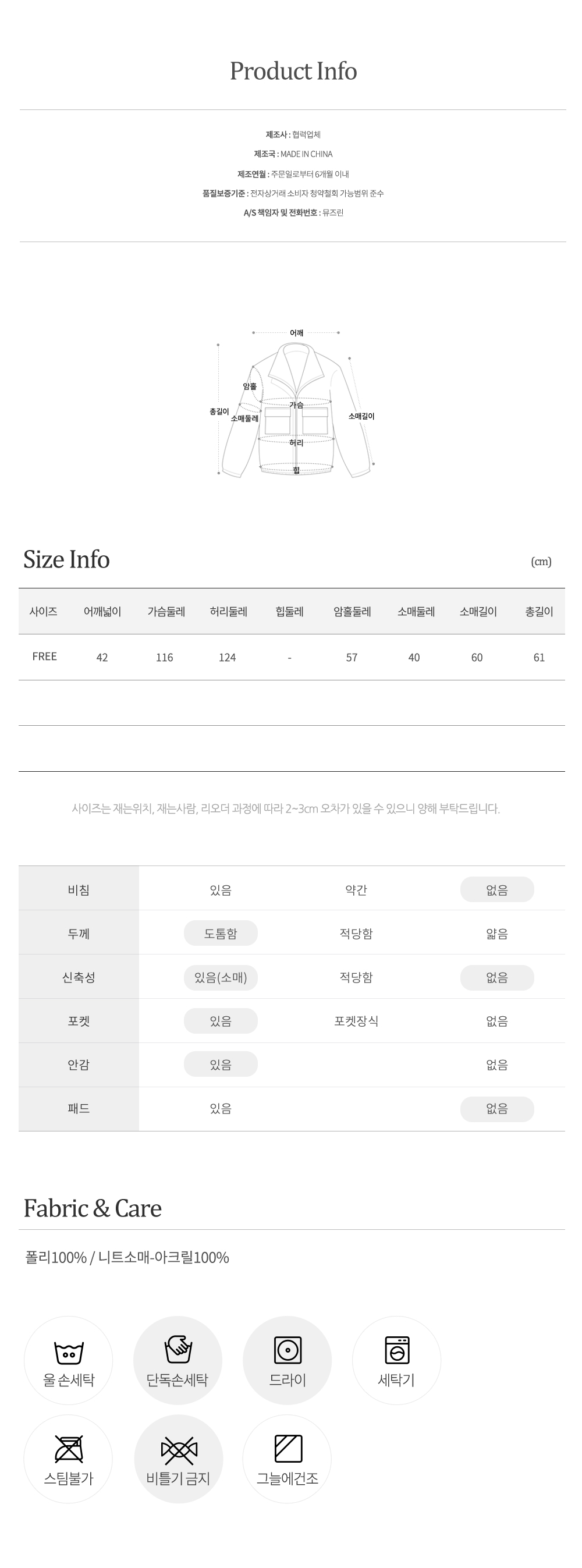 물세탁을 할 경우 건조후 약간의 수축현상이나 이염현상이 발생할 수 있으니 드라크리닝을 권장해 드립니다.