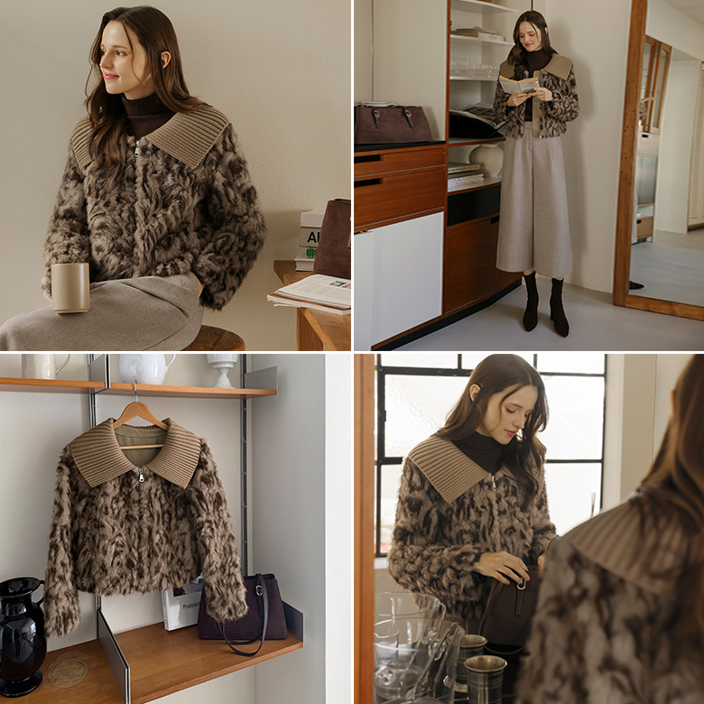 [뮤즈린] 주비 니트 빅카라 레오파드 밍크퍼 점퍼