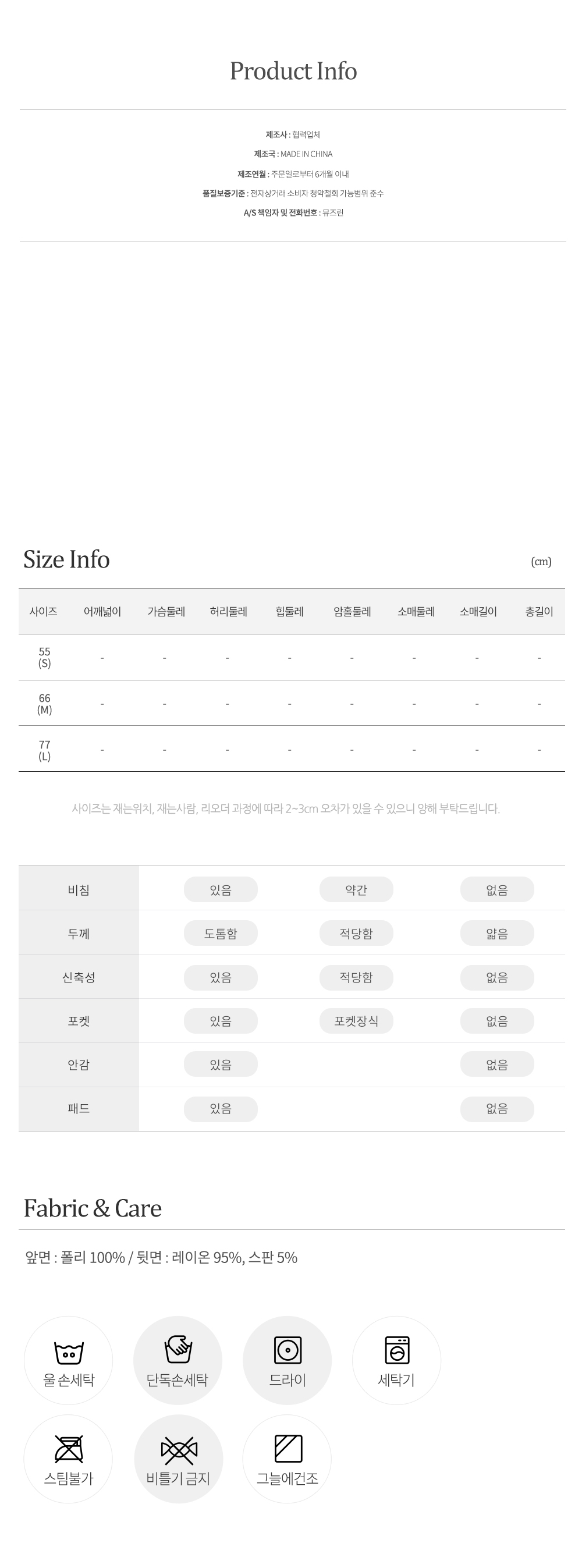물세탁을 할 경우 건조후 약간의 수축현상이나 이염현상이 발생할 수 있으니 드라크리닝을 권장해 드립니다.