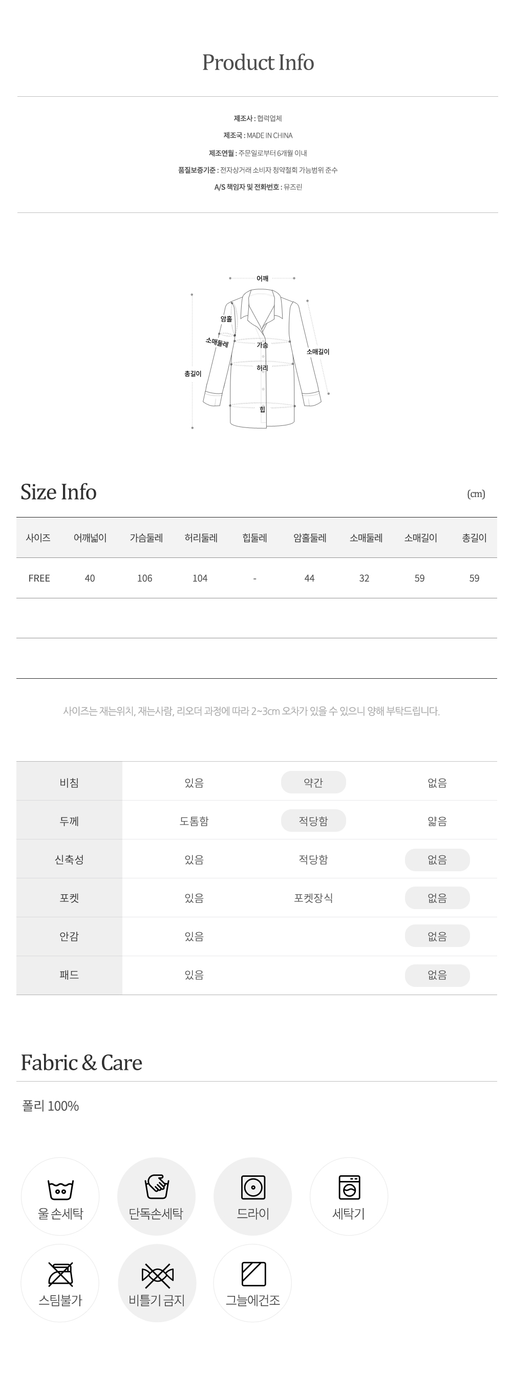물세탁을 할 경우 건조후 약간의 수축현상이나 이염현상이 발생할 수 있으니 드라크리닝을 권장해 드립니다.