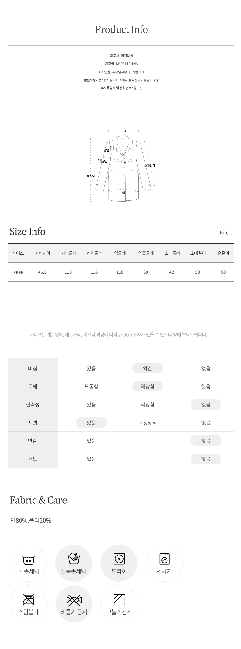 물세탁을 할 경우 건조후 약간의 수축현상이나 이염현상이 발생할 수 있으니 드라크리닝을 권장해 드립니다.