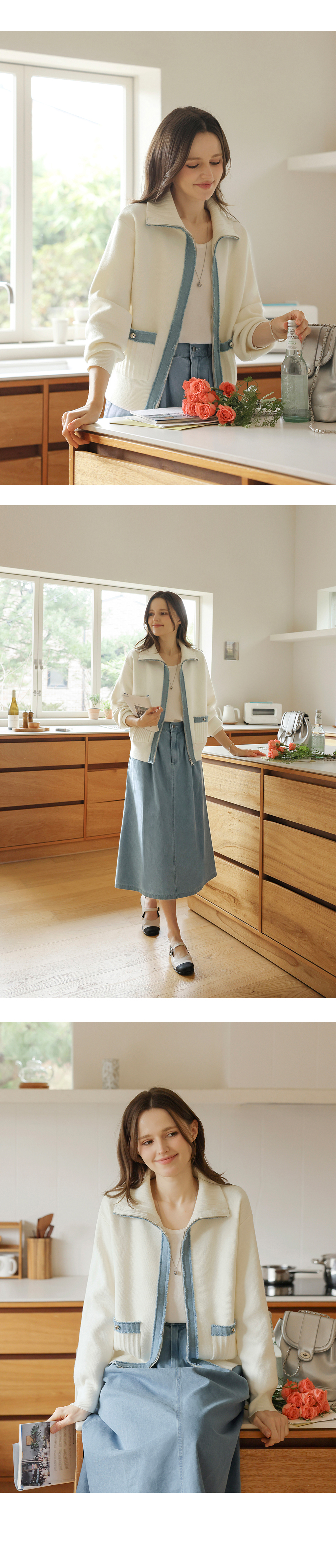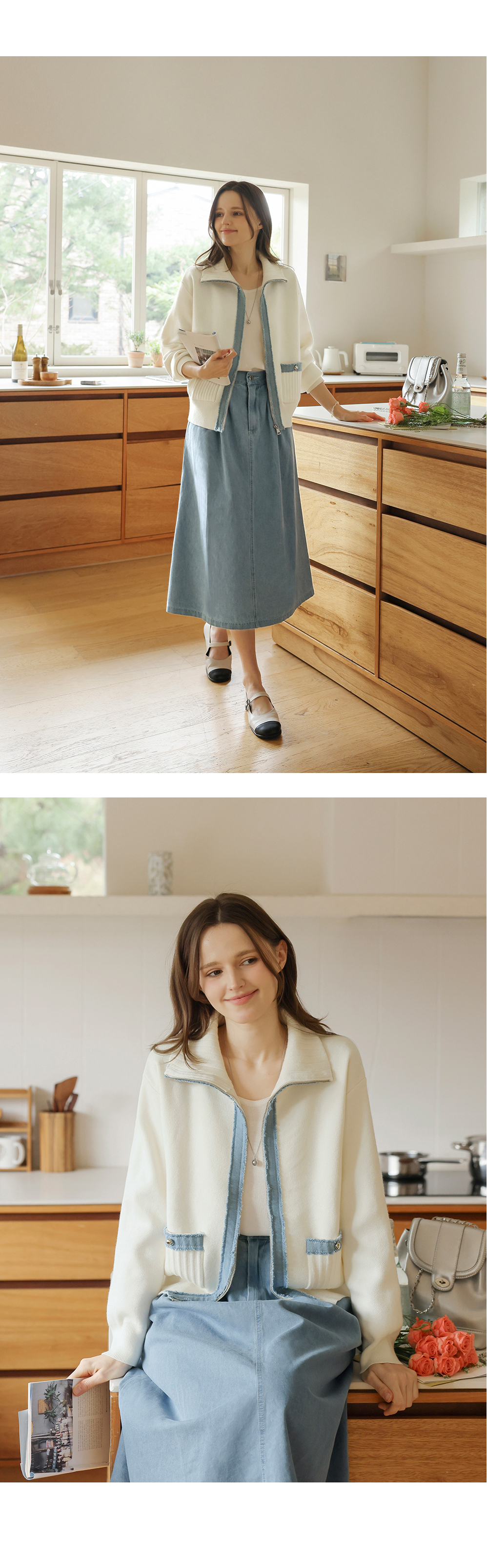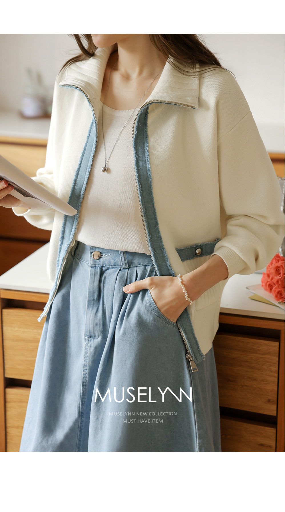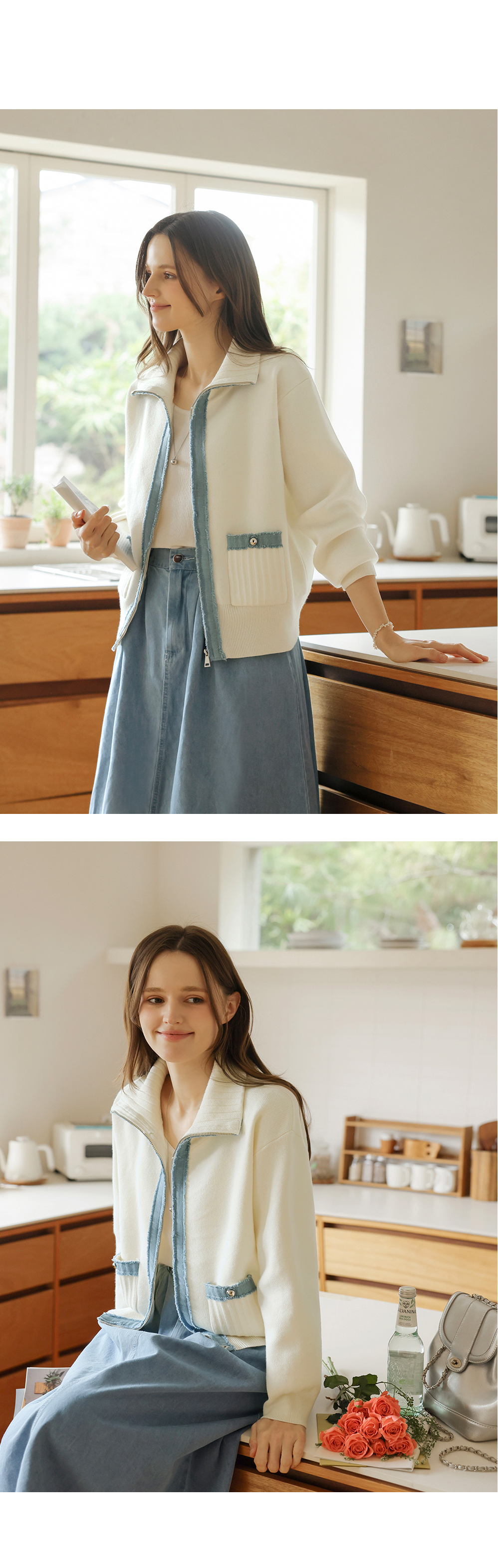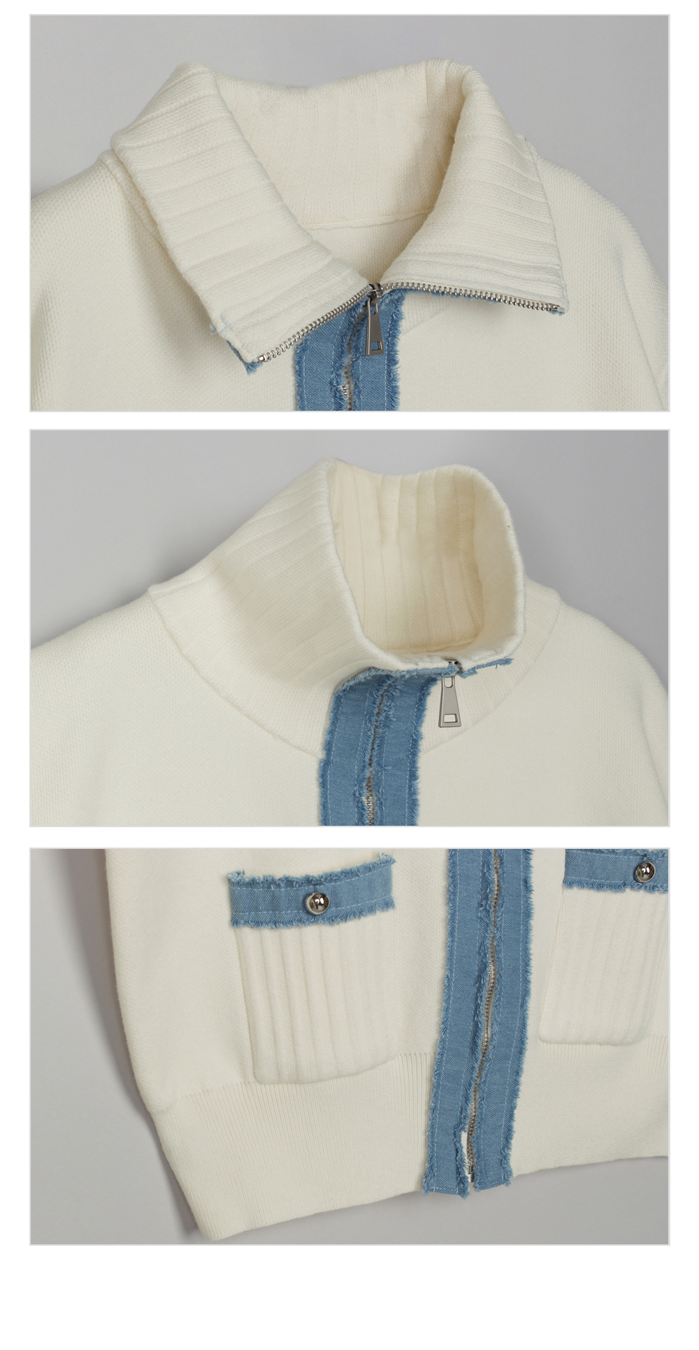 [뮤즈린] 치치 하이넥 데님배색 니트 집업