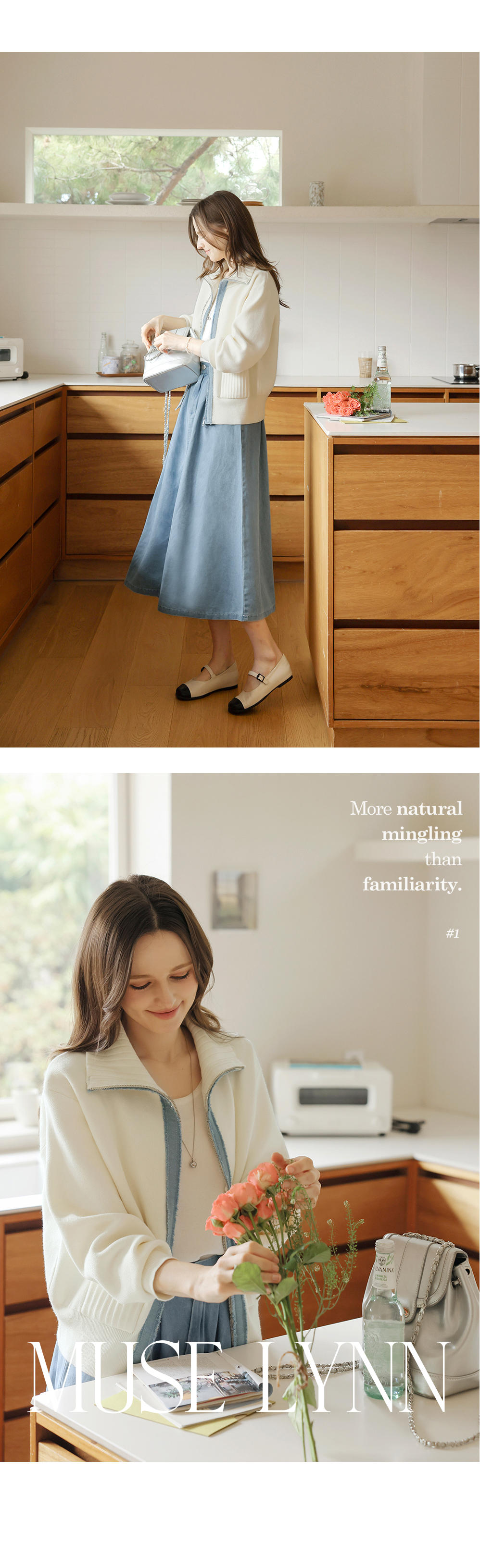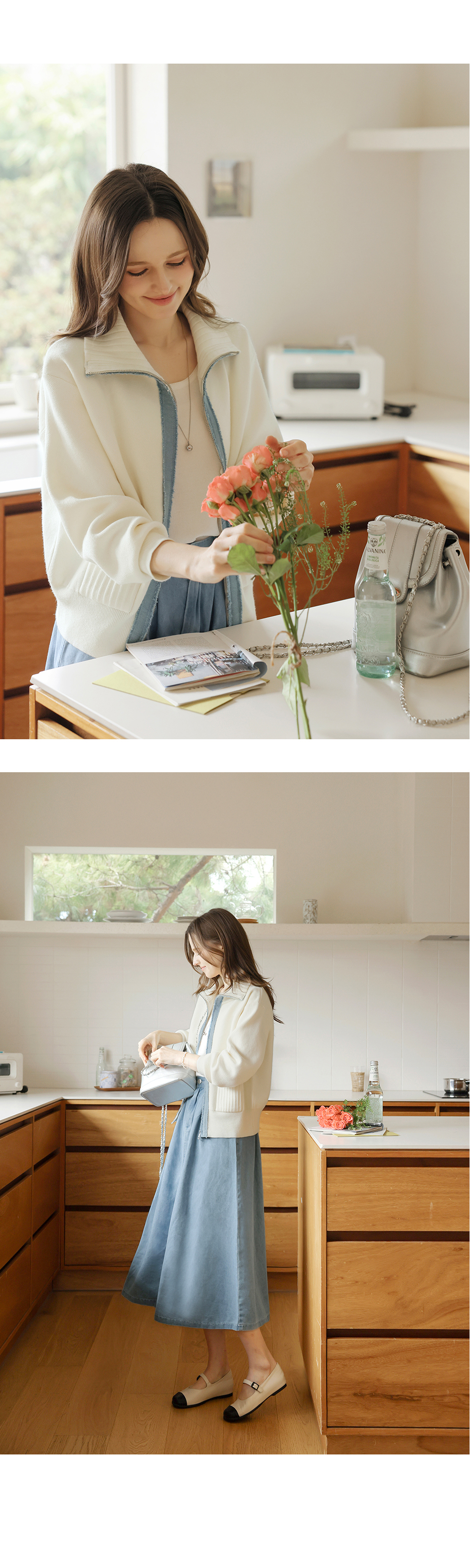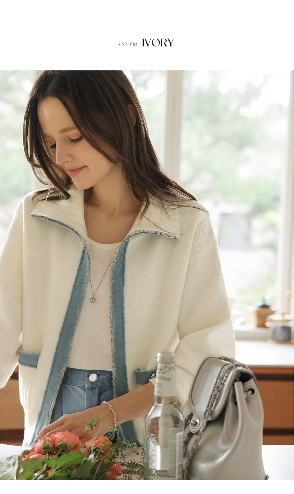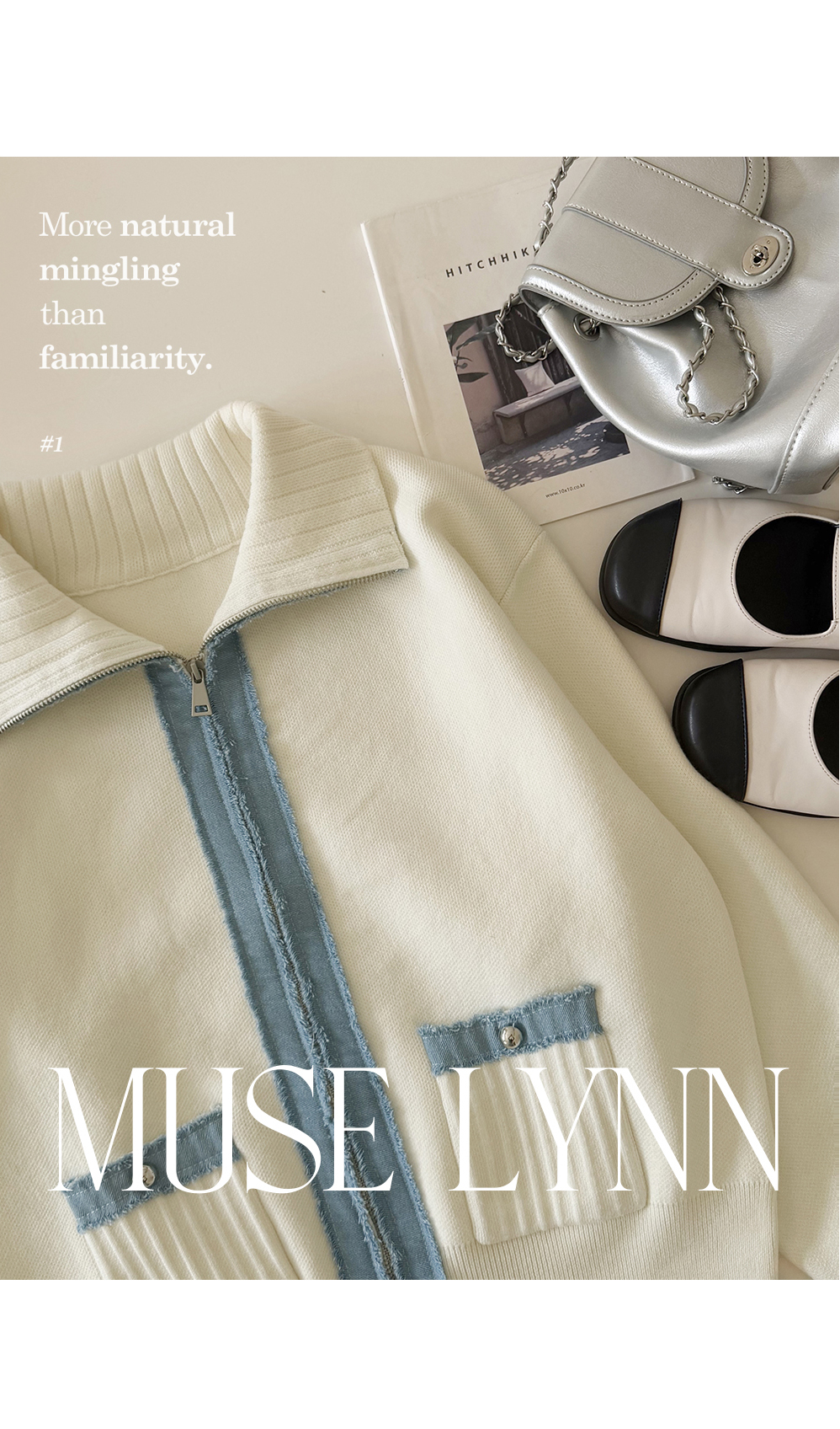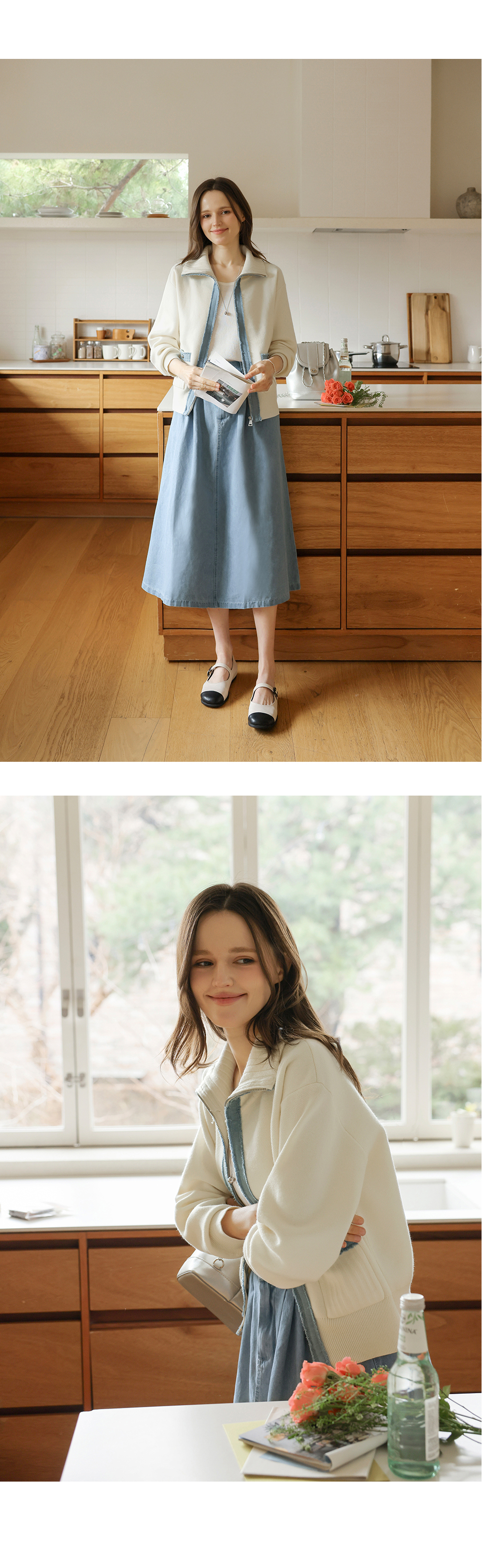 [뮤즈린] 치치 하이넥 데님배색 니트 집업