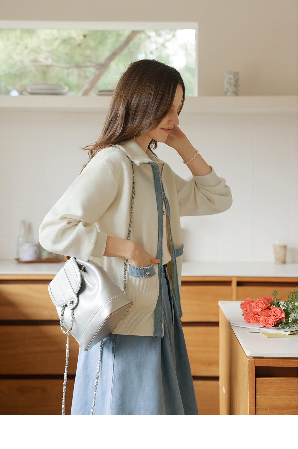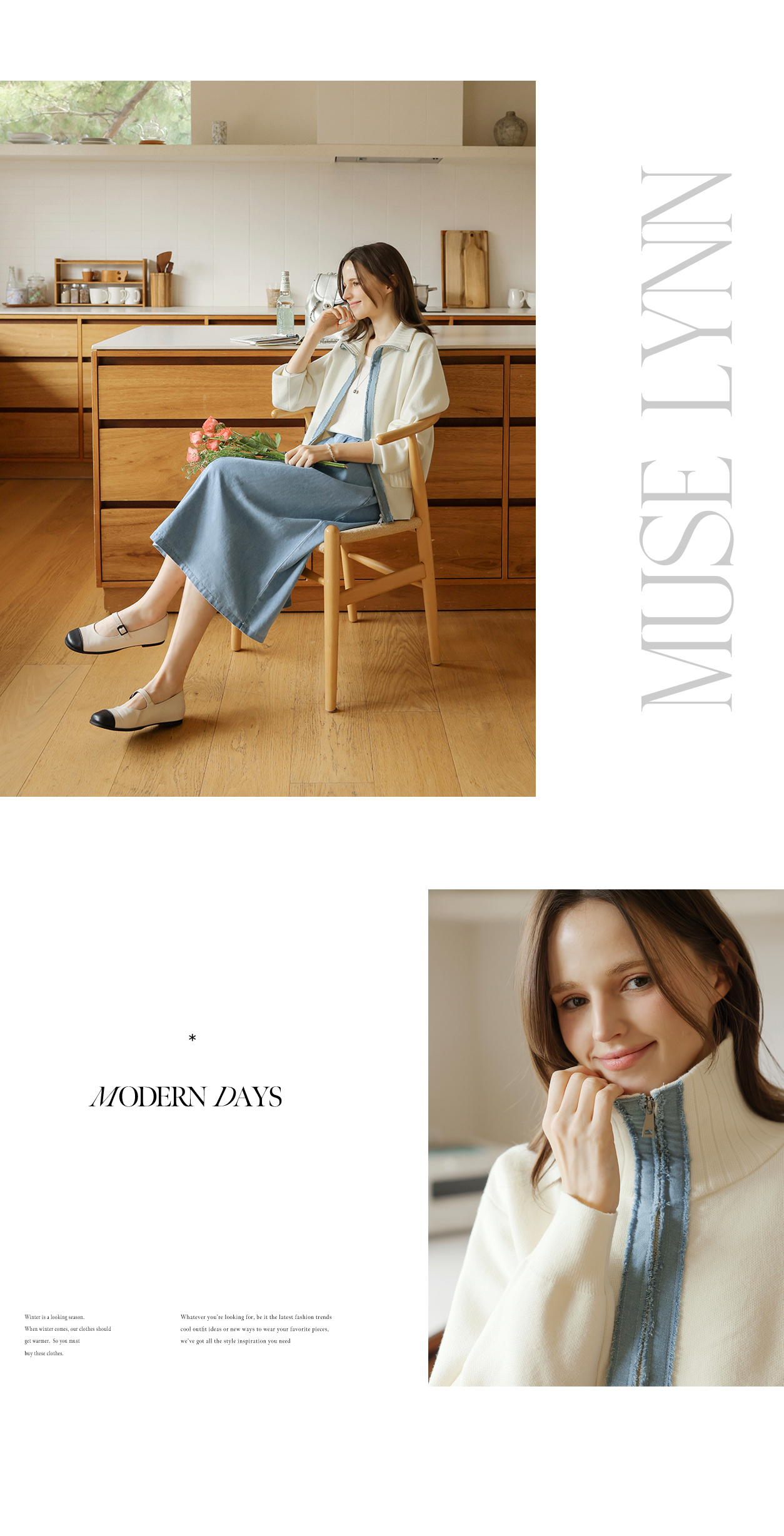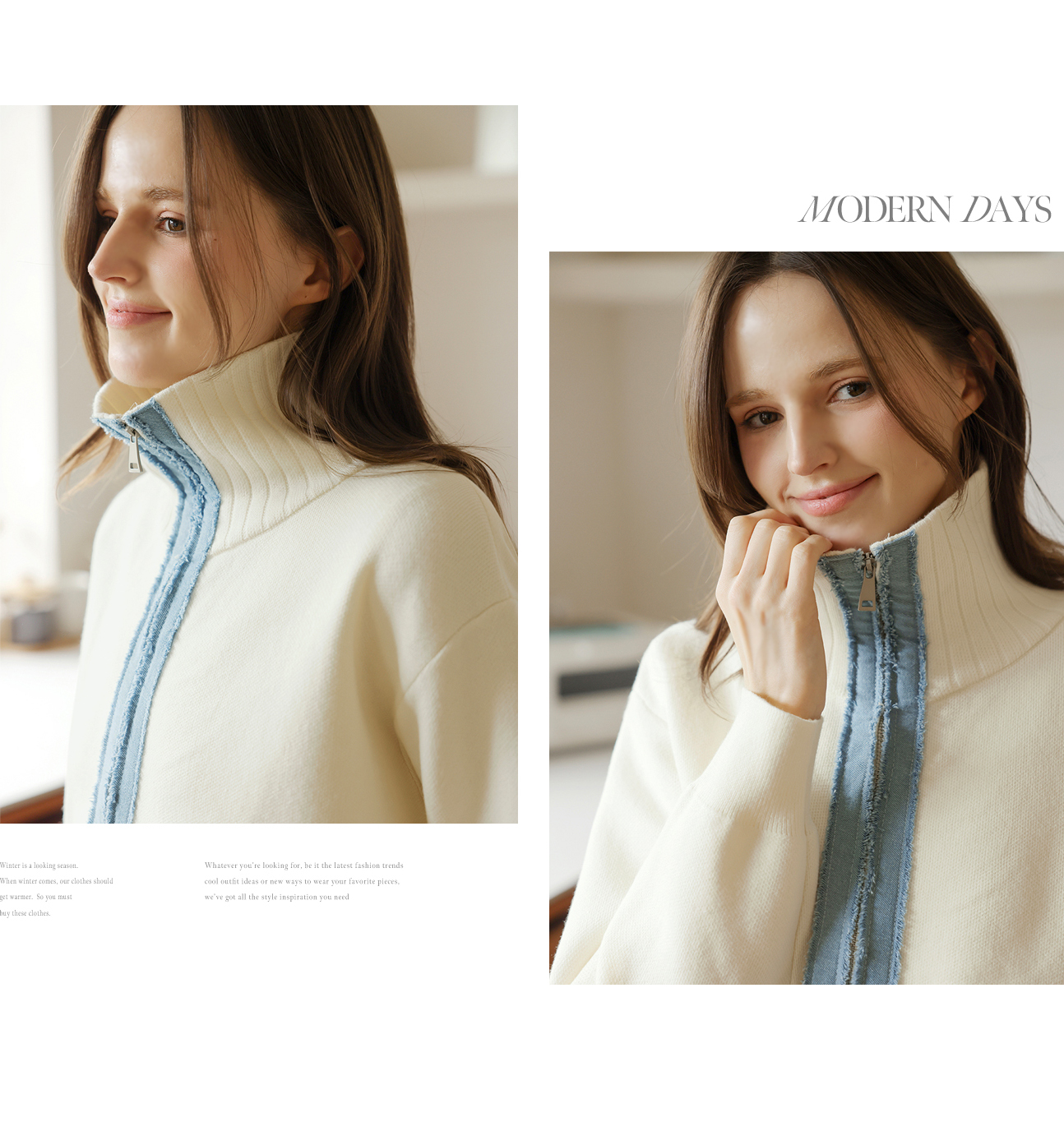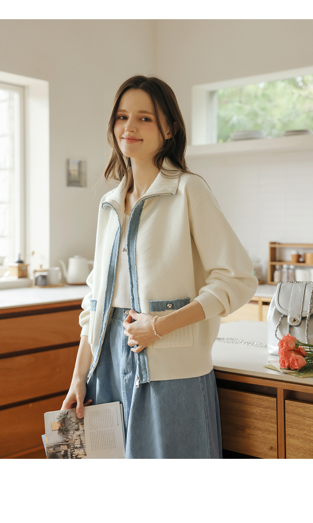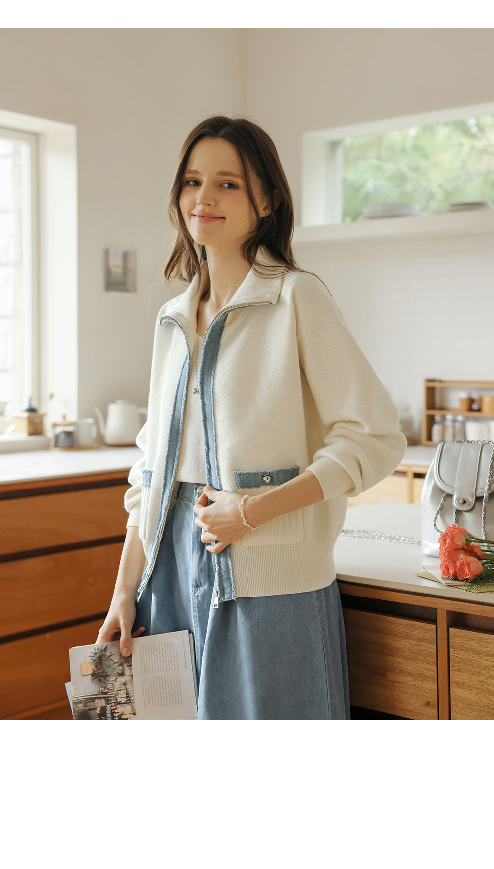 [뮤즈린] 치치 하이넥 데님배색 니트 집업