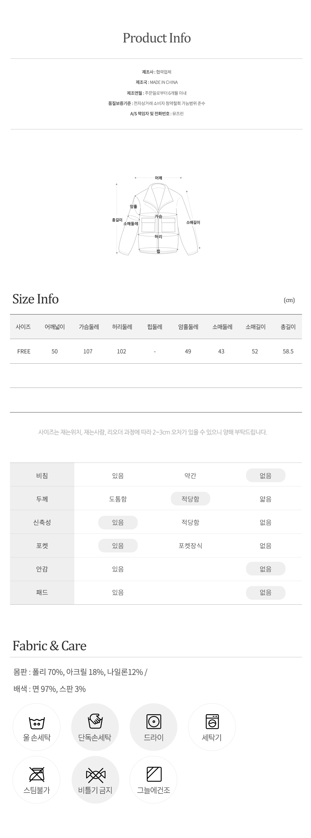 물세탁을 할 경우 건조후 약간의 수축현상이나 이염현상이 발생할 수 있으니 드라크리닝을 권장해 드립니다.