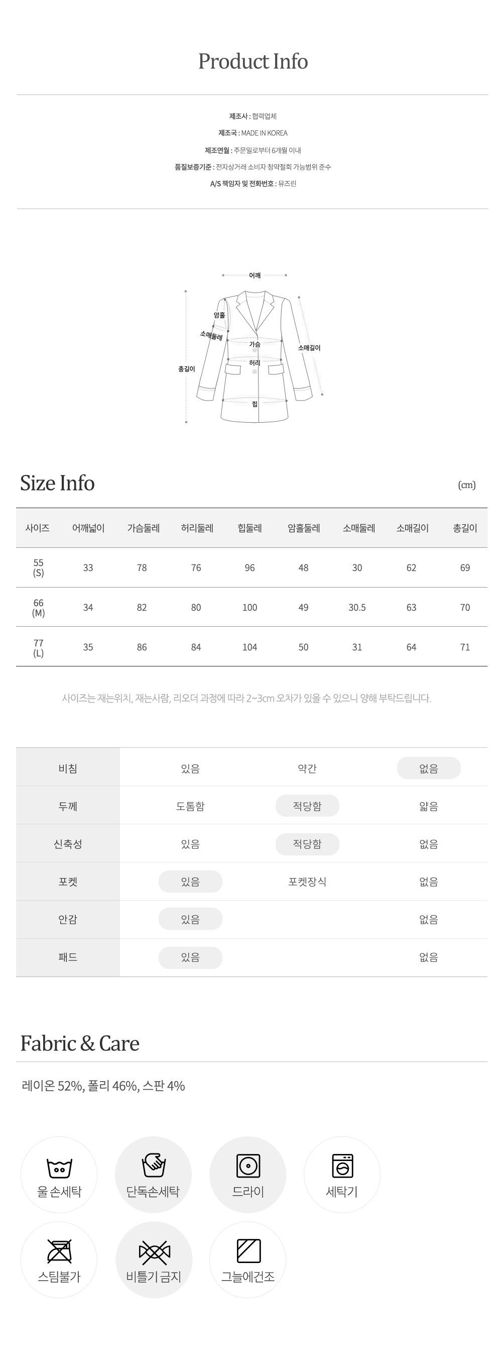 물세탁을 할 경우 건조후 약간의 수축현상이나 이염현상이 발생할 수 있으니 드라크리닝을 권장해 드립니다.