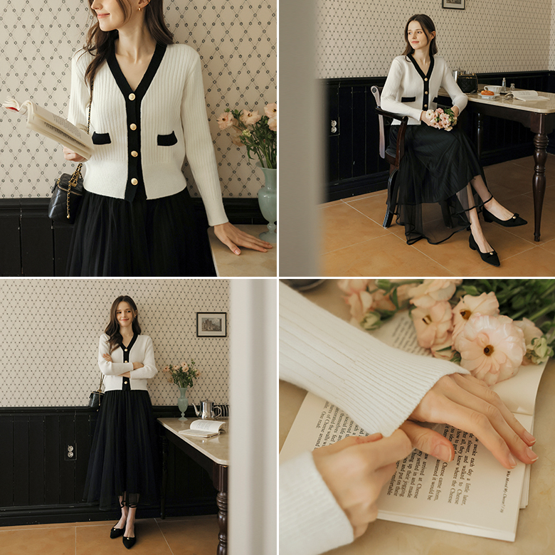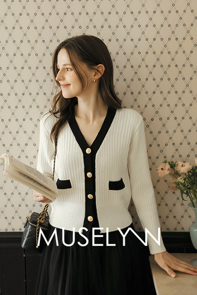 [뮤즈린] 피피린 골드버튼 배색 브이넥 가디건