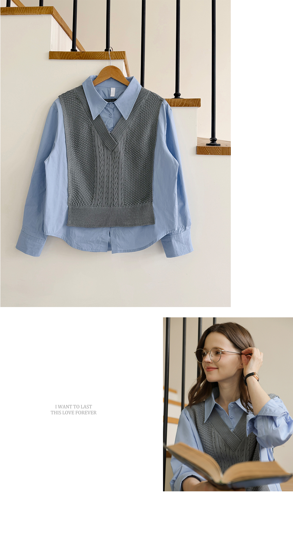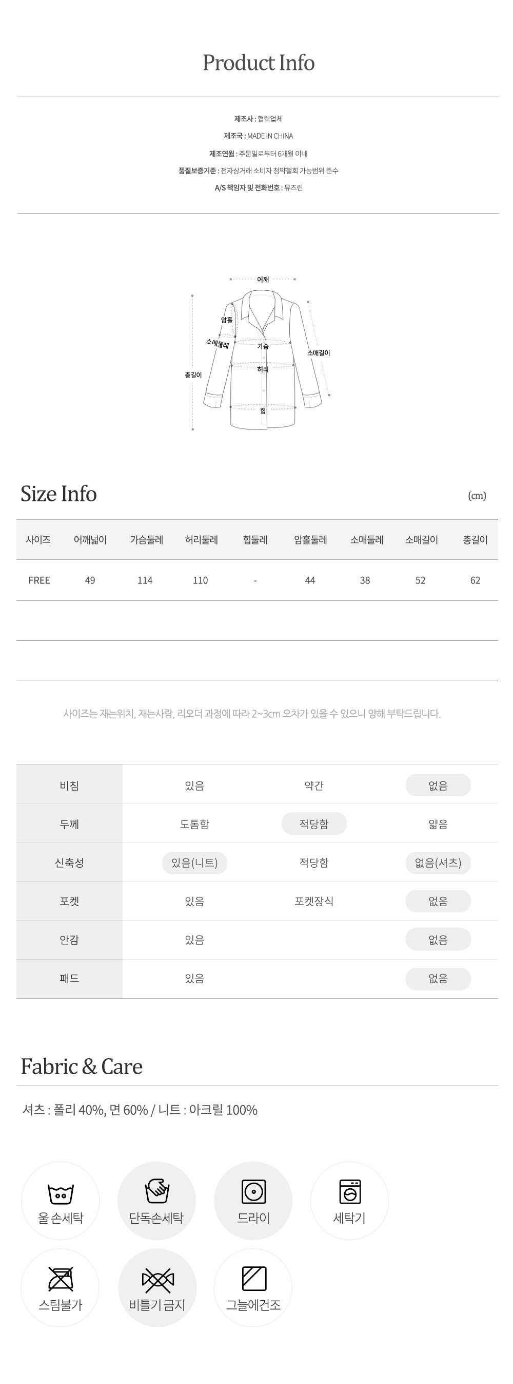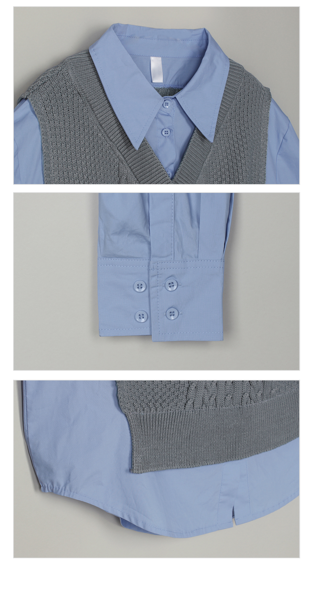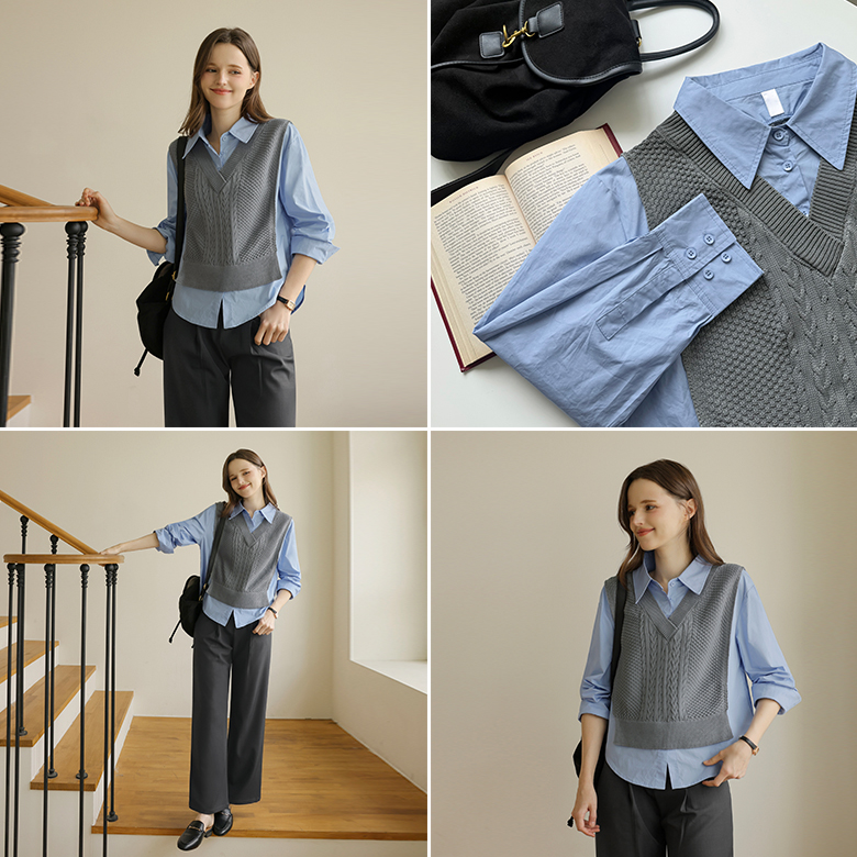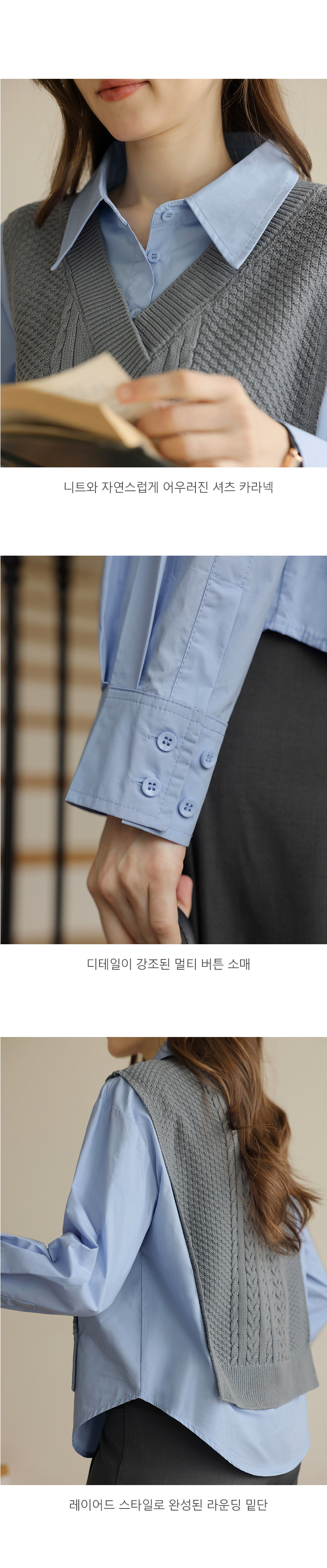 니트 : 아크릴 100% / 셔츠 : 면 60%, 폴리에스터 40%